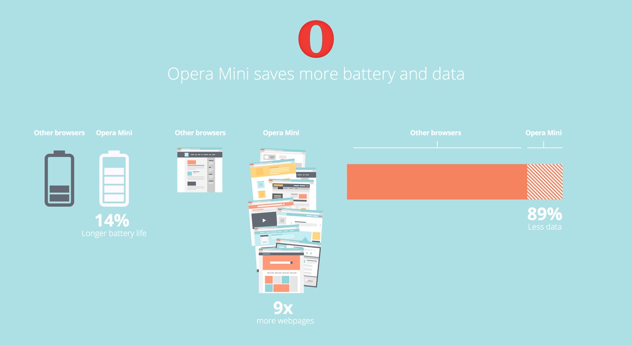 According to tests conducted by an independent firm Cigniti Technologies, Opera Mini web browser for Android saves both Data and Battery-life on your device. Opera Mini consumes 14% less battery and 89% less data when compared to the competition.