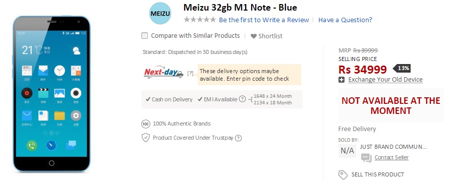 Meizu is entering India with the M1 Note soon, and it seems it has picked Snapdeal to be its exclusive online partner. A listing for the Meizu M1 Note has been spotted on Snapdeal with a ridiculous price tag of INR 34,999 for the 32 GB variant.
