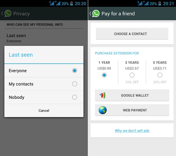 WhatsApp for Android has been updated to include option for disabling "Last Seen" privacy feature as well as option to pay for your friends subscription. The update also includes Hindi language support for Android 4.1 Jelly Bean and above users.